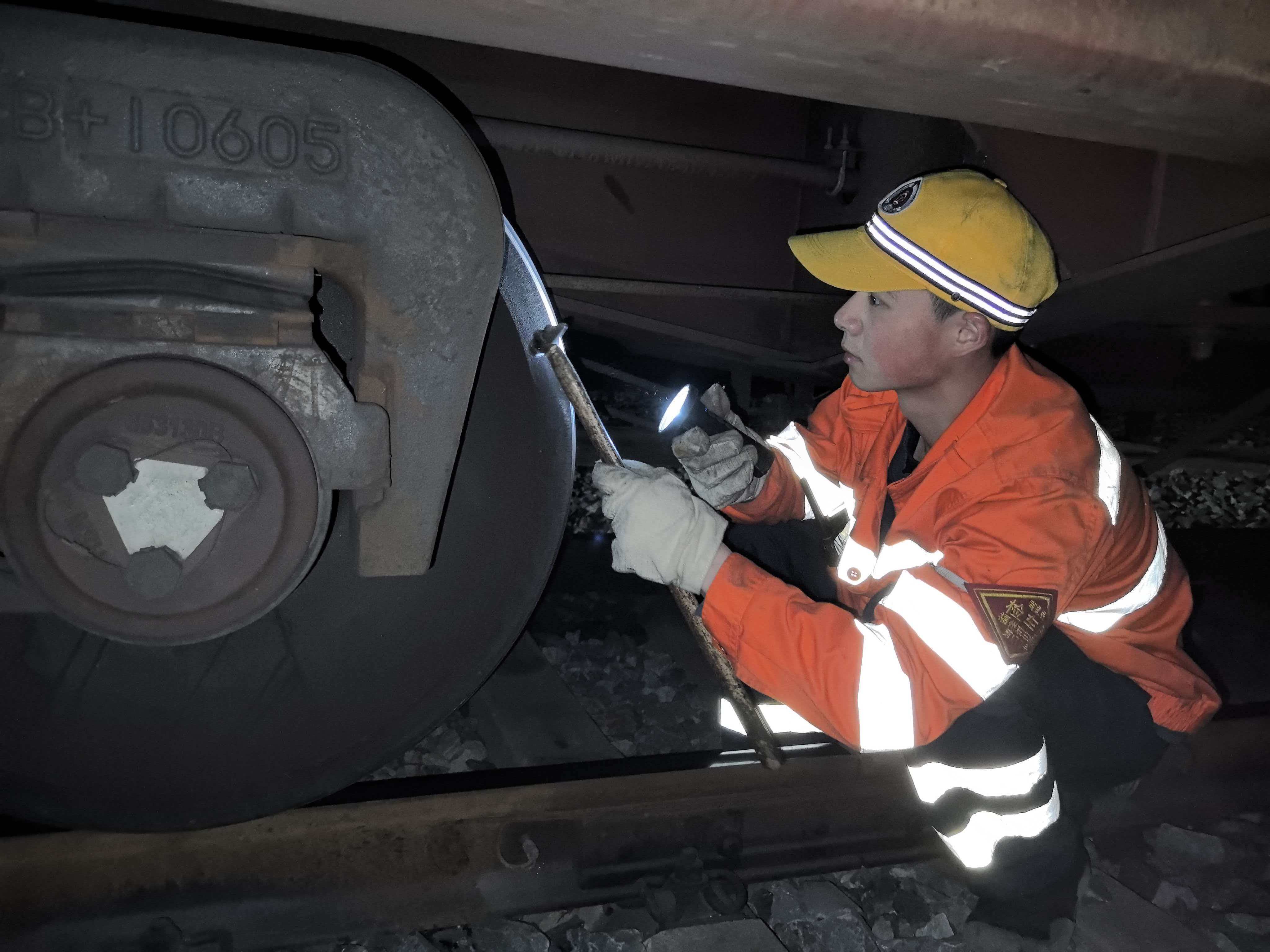 今年是王奇德参加工作后的第4个春运。接到指令后,他一把抓起检车锤与工友快步走向目标车辆。半蹲、侧身、探入车底,动作一气呵成。车下空间狭窄,制动梁与拉杆纵横交错,他小心地收着肚子,几乎贴着轨枕挤进去,手电的光束在火车轮缘与踏面之间快速扫过。