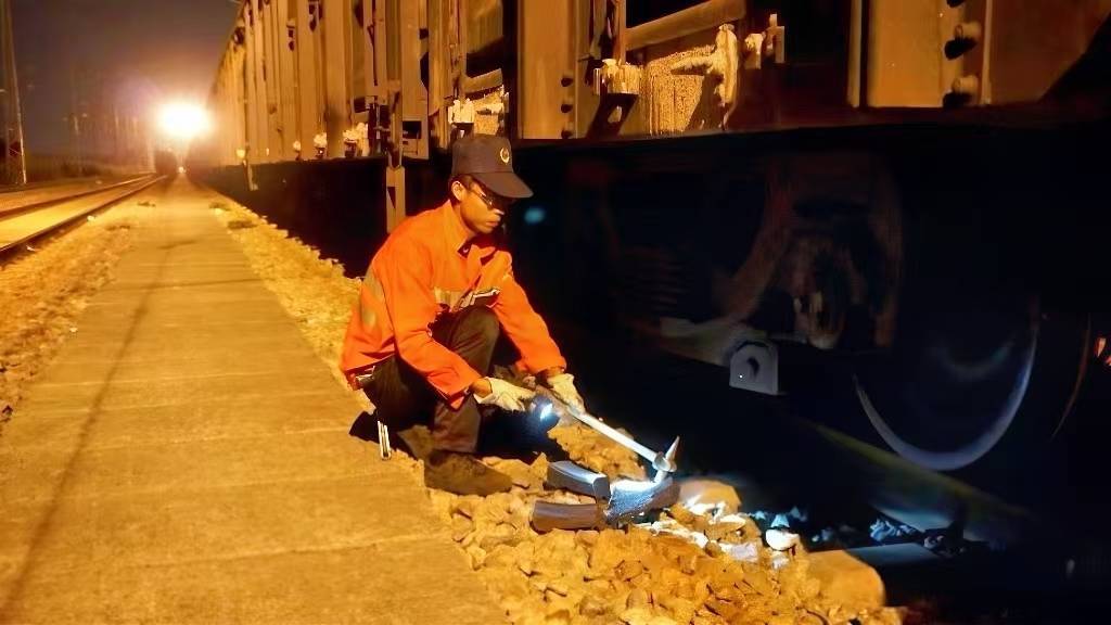 铁路货车检车员在更换货车制动闸瓦。新华社发将近凌晨一点,王奇德用对讲机向值班员报告X8218次列车相关作业完毕后,又拎起工具走向下一股道。几分钟后,这列满载“中国制造”的中欧班列鸣笛启程,向着数千公里外的目的地驶去。