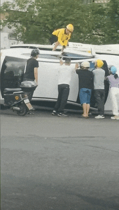 危急时刻,紧急营救!眼见车辆侧翻,外卖小哥李先生迅速爬上车身,努力打开车门开展营救,其他路过群众纷纷停车上前扶住车身,防止车辆倾倒。